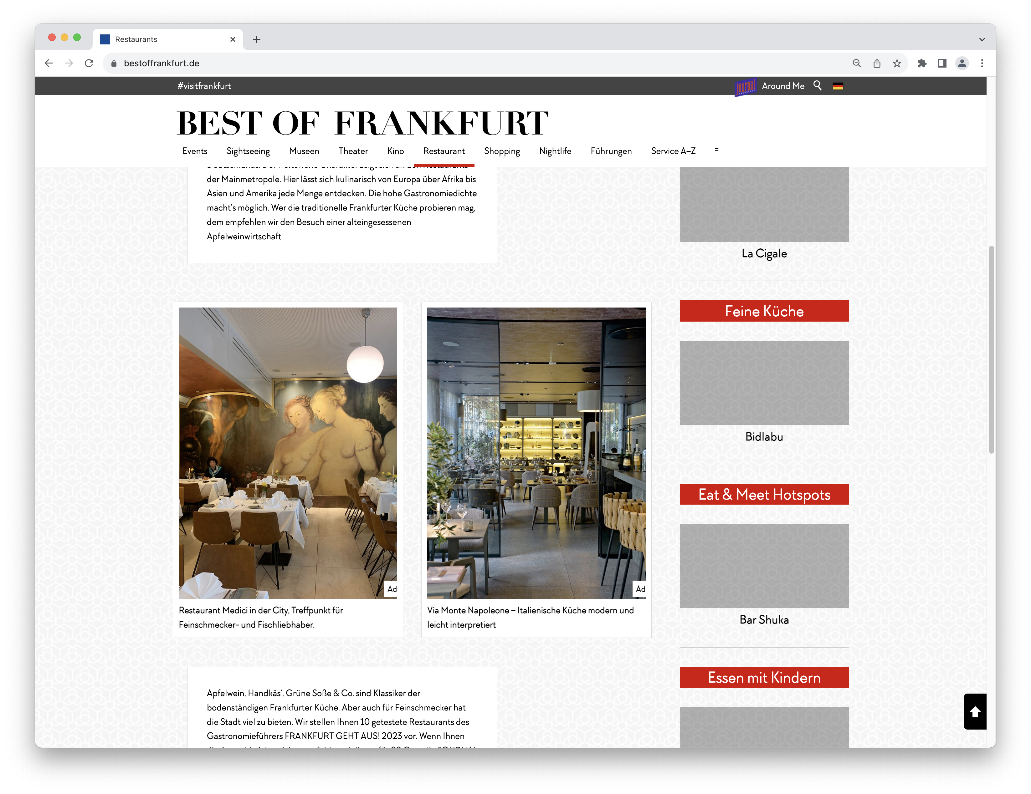 prominente Platzierung in redaktionellem Umfeld. Mögliche Rubriken: Museen, Theater, Film, Restaurants, Shopping, Touren, Nightlife